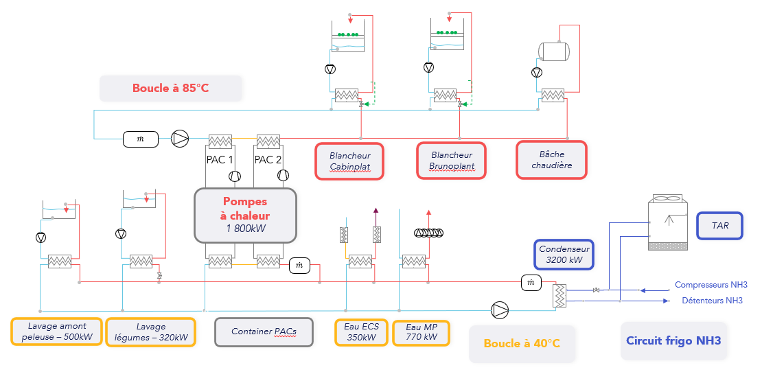 Installation de récupération de chaleur sur TAR pour valorisation en direct sur des besoin à 40 °C et valorisation via une pompe à chaleur pour les besoins à 85 °C.